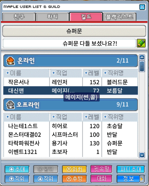 - 길드창에서 현재 이름, 직업, 레벨, 직위명 정렬 기능이 현재 지원되지 않습니다. 추후 지원 예정입니다.