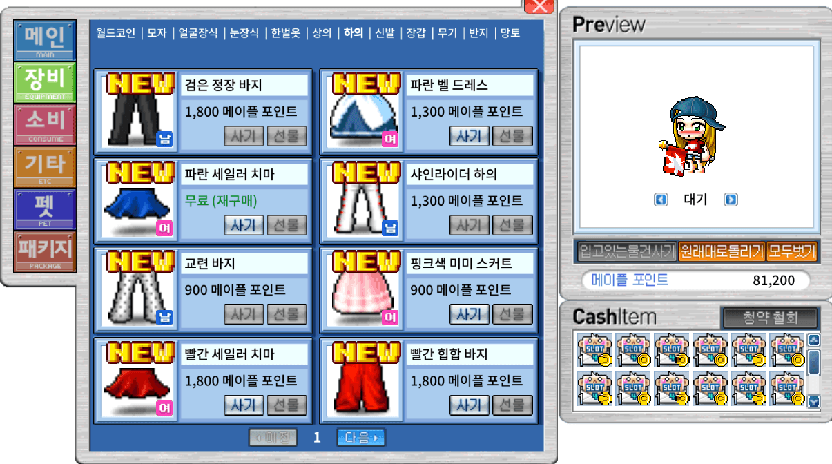 ※ 이미 메이플포인트를 사용해 구매한 적 있는 장비 치장 아이템은 무료로 재구매 할 수 있습니다.