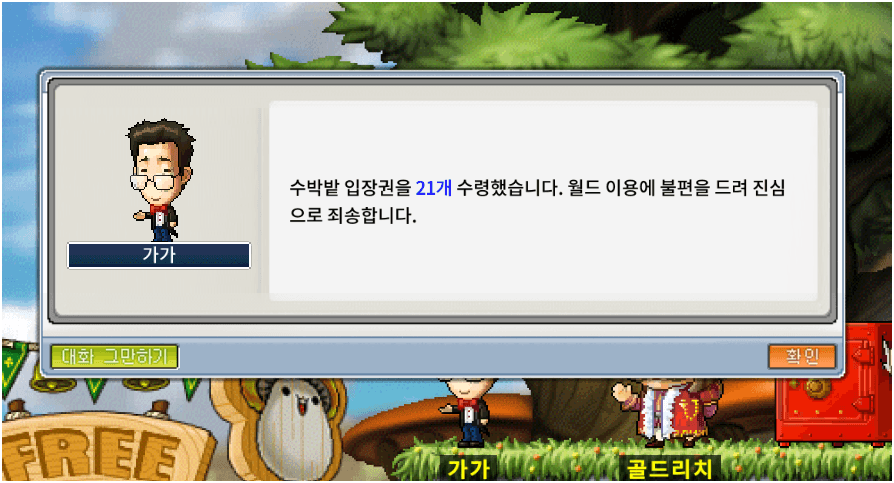 이렇게 사라진 수박밭 입장권 아이템 또한 자유시장입구의 NPC <가가>에게 새로운 수박밭 입장권을 돌려받으실 수 있습니다.