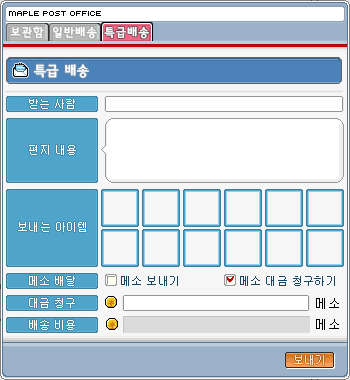 기존 메이플스토리 원작에 있던 ‘택배’ 기능은 아이템과 메소를 일회성으로 보내기만 가능했습니다. 또한, 퀵배송을 통하지 않을 경우 발송 시간이 오래 걸리는 등 불편한 점이 있었습니다.