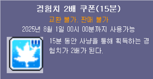 - 경험치 2배 쿠폰(15분) (4개) (8월 1일 00시까지 사용 가능)
